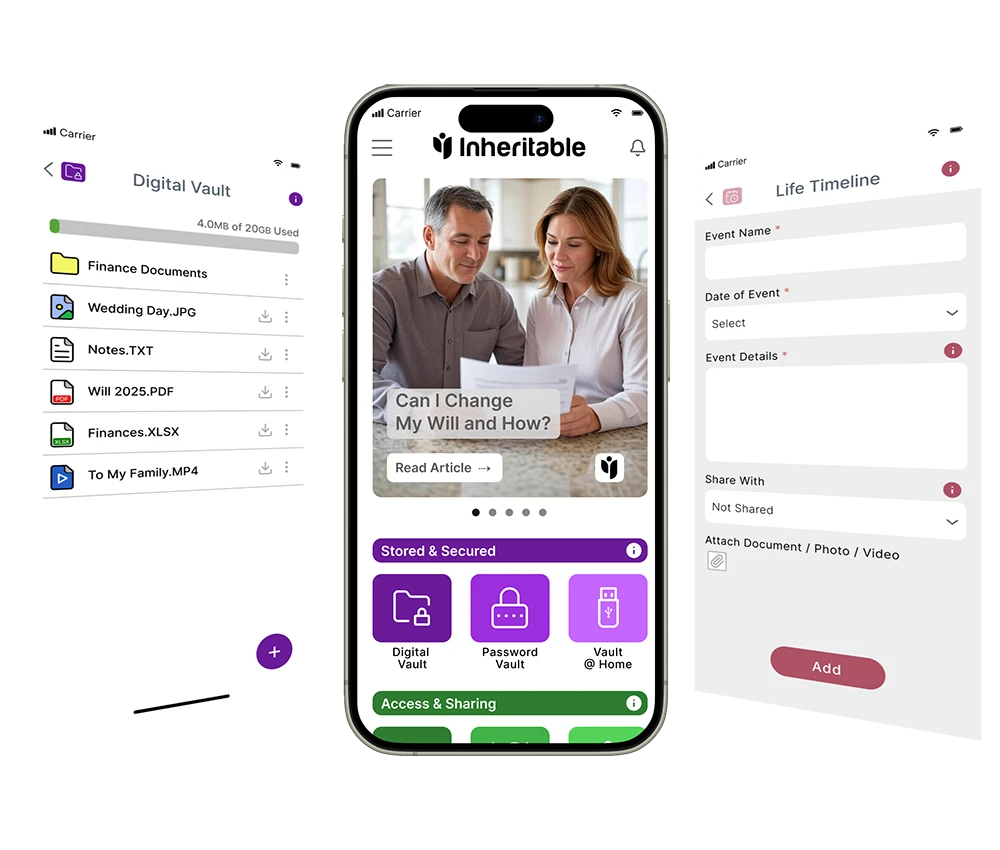Inheritable is a secure digital vault that keeps your memories, documents, and wishes safe, private, and beautifully organised. Every item is encrypted with military-grade protection, ensuring only you and the people you trust can ever access it.